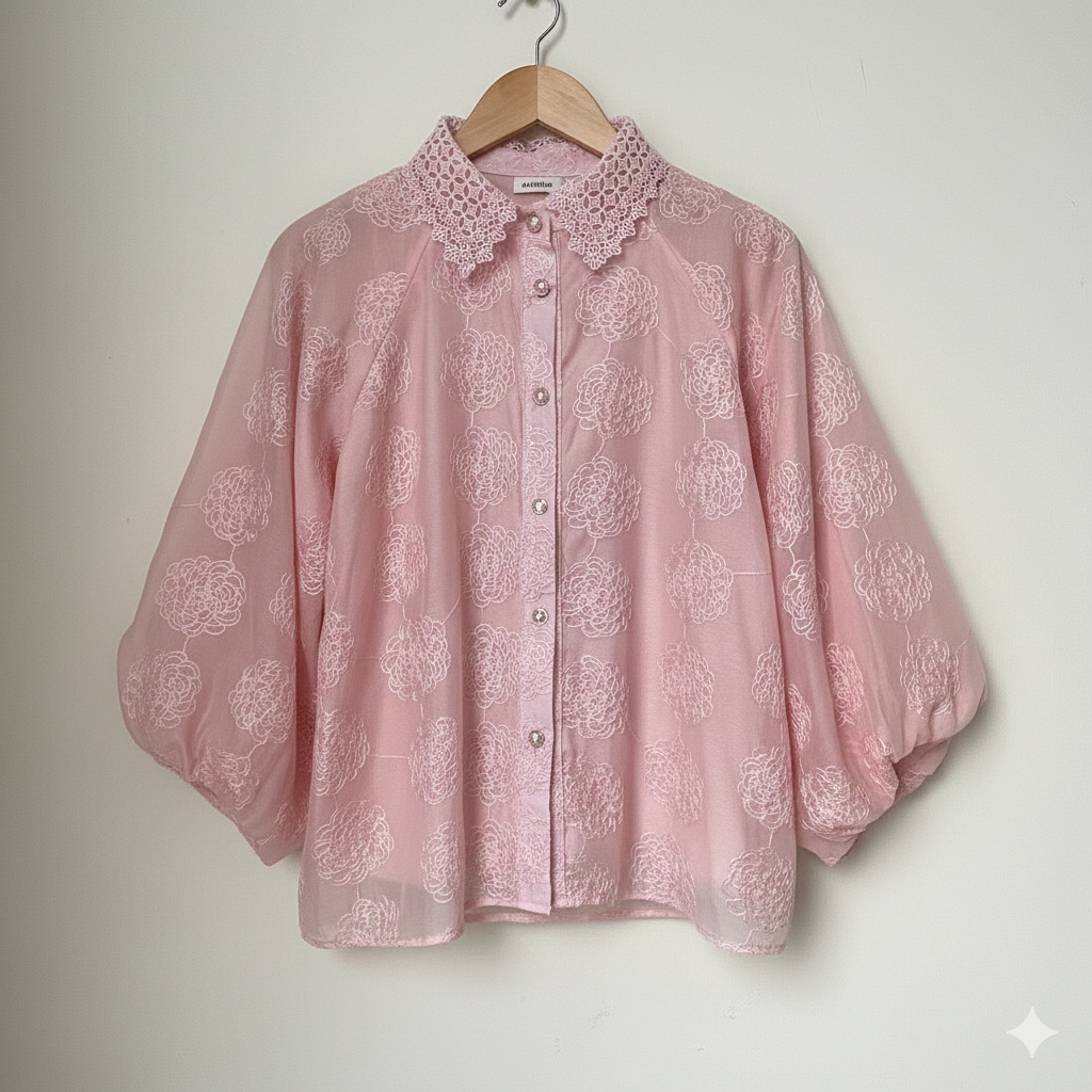 Blouse Rose Lace Puff – Hamfara hadir dengan desain feminin dan elegan yang memancarkan kesan lembut. Menggunakan bahan transparan ringan dengan motif bunga timbul yang cantik, blouse ini tampil anggun tanpa berlebihan. Detail kerah renda menambah sentuhan klasik dan manis, sementara lengan puff memberikan siluet yang stylish dan nyaman dipakai.